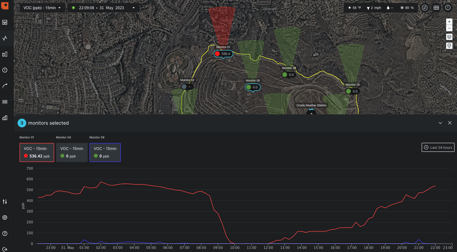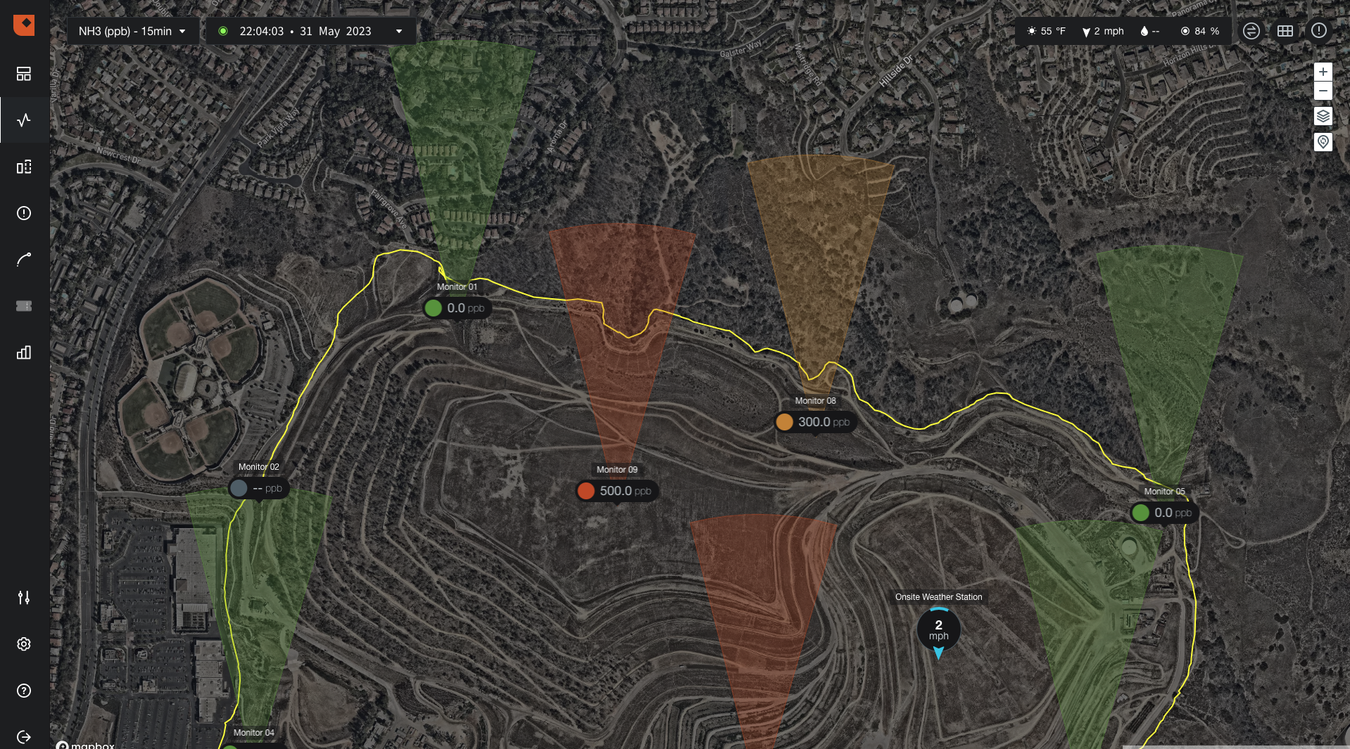 'Arcs of Infleunce' from Envirosuite's Omnis software help instantly understand the most likely source or area with sources that could be causing an unfolding emissions event or a threshold breach.