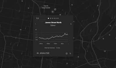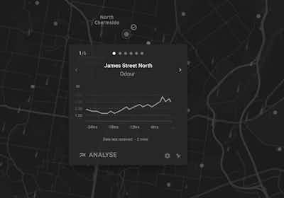 Envirosuite's regional view displaying real-time Odour Intensity using a network of low-cost E-Noses