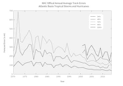 Annual average official track errors for Atlantic basin tropical storms and hurricanes for the period 1970-2017, with least-squares trend lines superimposed. Image: NOAA