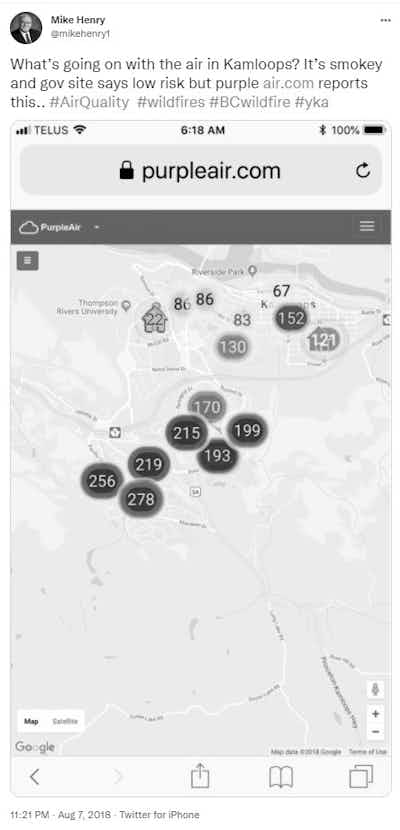 An example of shared Purple Air data on Twitter showing high PM readings caused by the Wildfires