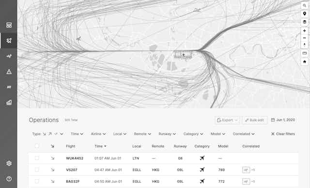 A user-friendly display shows flights, weather, noise monitoring locations, noise level graphs and point of closest approach.